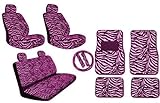 Premium New Style Pink Zebra 15pc Low Back Front Seat Covers, Bench Seat Cover with Head Rest, Steering Wheel Cover with Shoulder Pads, 4pc Front and Back Floor Mats